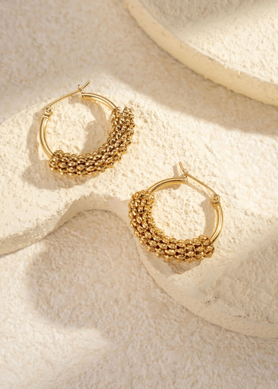 - Goldfarbene Creolen mit aufwendig gearbeiteter, mehrreihiger Perlenstruktur